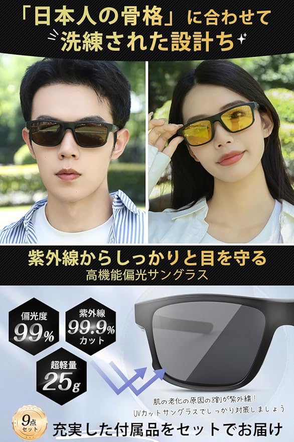 【 高品質偏光レンズを採用】高解像度の偏光サングラス UV400(99%以上の紫外線遮断) レンズ保護フィルムにより、有害な UVA と UVB を遮断し、本来の色を復元し、写真本来の色を維持します。さらに、ブルーライト軽減効果もあり。長時間つけていても目が疲れません!光の反射やぎらつきを極限までカットしながら視界をくっきり見せる多層構造レンズを採用。