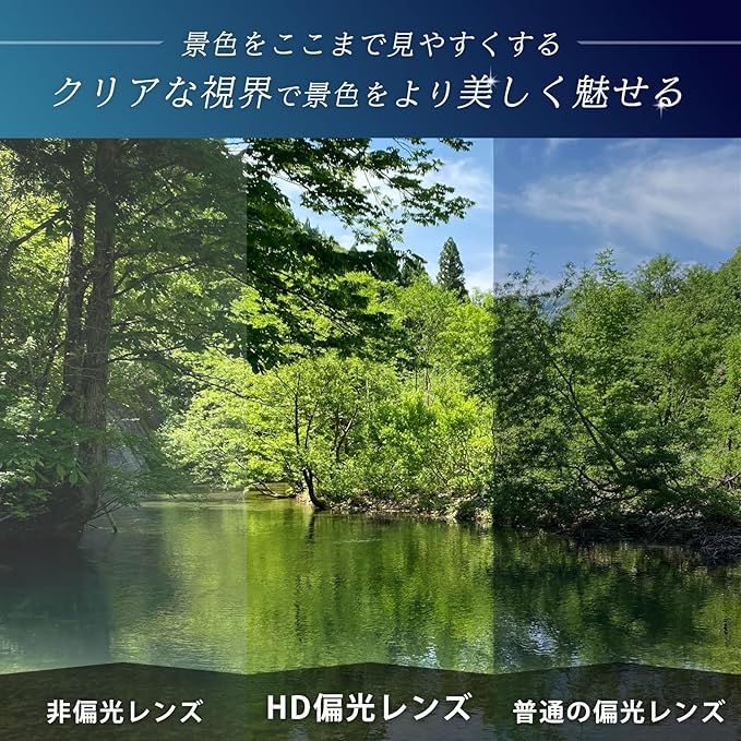 ✅【視界のクオリティを変える偏光グラス】 HD偏光フィルター採用の偏光レンズにより紫外線(UV)UV-A、UV-B、およびUV-Cの3つの波長帯に対して保護効果を発揮します。 より自然な色合いで見ることができ、視界の歪みを最小限に抑えます。 HD偏光レンズは、光の屈折率を抑えるため、反射光や眩しさを軽減し、運転中や釣り、スポーツで視界をクリアに保ちます。 この偏光グラスは軽量で柔軟性があるため、長時間の使用でも疲労を軽減。 フィット性の高いフレームとHD偏光フィルターが融合して完成した高性能スポーツサングラス。 視覚性能を求める方におすすめの高品質サングラスです。