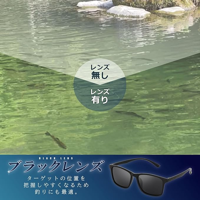 ✅【偏光サングラスと釣りの使い方】 偏光サングラスを使用することで、水面の反射光、屈折光を軽減し、水中の魚の姿や動きをより鮮明に確認することができます。 釣りにおいては、水面の反射を抑え深い水面で魚の動きをしっかり確認できるブラック系のレンズが◎ 特にブラック系の偏光レンズの特徴として日差しが強い場合や夏場は高遮光率の高いブラックレンズを選ぶと◎ 偏光サングラスを使用する際には、偏光グラスの位置と立ち位置を調節することが重要です。 立ち位置を微調整することで、反射光や屈折光をより効果的にカットすることができます。 偏光サングラスをしっかりとかけて、効果的に使用することで釣果の向上につなげることができます。