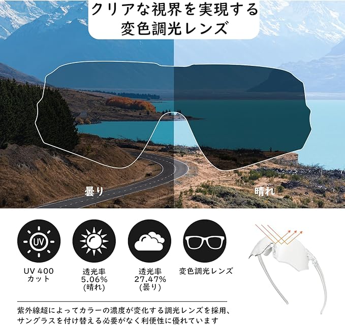 【調光変色レンズ&紫外線カット】紫外線の強さ(強い光や紫外線を浴びると濃い色に・室内などに入ると薄い色に)によってレンズの濃度が変化するので、室内ではクリアレンズに、屋外ではサングラスに、と一本二役の便利さを実現します。自転車で走行する時に、快晴→曇り→雨という天候の変化やトンネルでも視界はクリアなままで、昼夜を問わず着用できて便利なスポーツサングラスです。そして、UV400機能のレンズで、紫外線を99%以上カットし、有害な紫外線から、目を強力に守ってくれます。