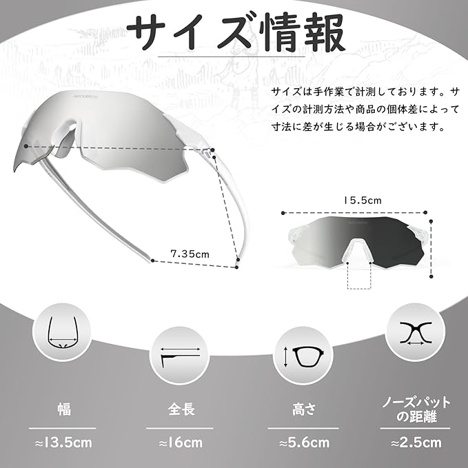 【もっとデザイン】①テンプルの裏側には大き目のシリコンを付き、着用時の摩擦を増加し、どんな場合には滑り落ちることが避けます。②リムレスレンズを採用することで、ライディング中の視界障害を軽減し、隠れた危険を減らし、クリアな視界を提供します。③ノーズパット2個がついており、いつでも取り外して汗や汚れを洗い流し、フレームを清潔に保つことができます。
