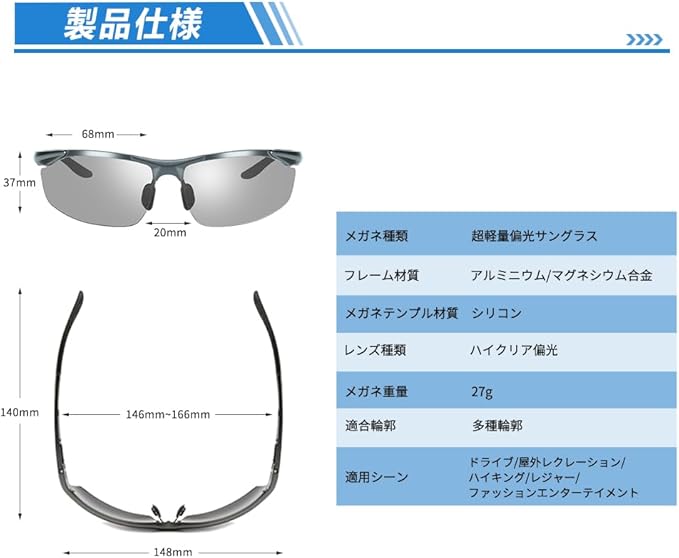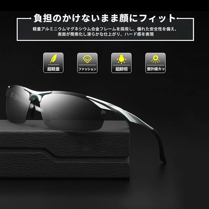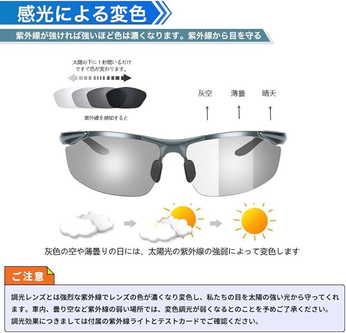➤【高速調光】調光レンズとは太陽光の紫外線の強弱によって変色します。晴天時の場合、強烈な紫外線よってレンズの色が濃くなり、有効的に私たちの目を太陽の強い光から守ってくれます、雲の多い天気の場合、やや光が抑えめになりレンズの色が若干薄めになることで、視野の明るさを確保し、事故を防ぎます。