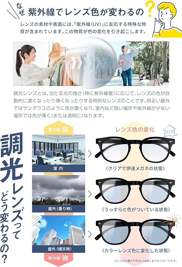 屋内(紫外線なし)→ 色が薄くなる 室内など紫外線が当たらない場所に入ると、特殊な物質は元の状態に戻ります。すると、レンズの色も自然に薄くなり、クリアに近い視界に戻ります。