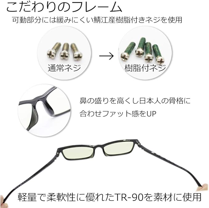 ■フレームには宇宙開発でも使用される軽くて柔軟性のある素材TR-90を使用。日本人の骨格に合わせて設計したフレームの為、フィット感抜群!持ち運びに便利な【レザーソフトケース】と【TEIJIN社製メガネ拭き】付