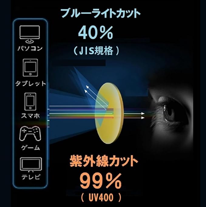 【ブルーライトカット率JIS規格40%】 40%カットレンズは、デスクワーカーなど、仕事でPCを長時間を使用する人や、eスポーツやゲーマー・スマホを長時間使う方の為に適したカット率です。