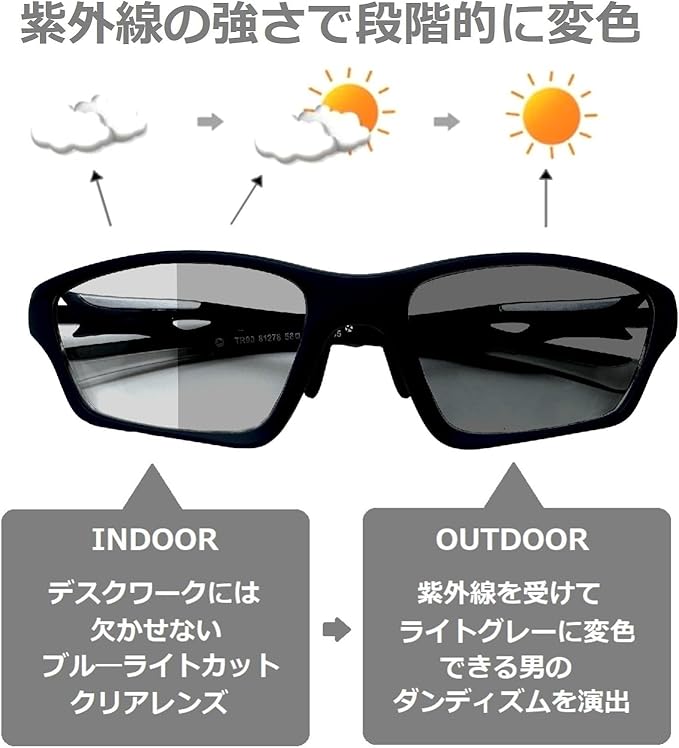 [REONAS] スポーツメガネ 調光 変色 ブルーライトカット PCワークから外出時はサングラスへ変化する2Way仕様 軽量 UV400 eスポーツ/スポーツ観戦