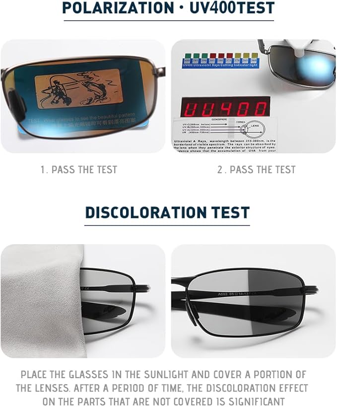 偏光レンズは最大限の保護を提供します:このサングラスは99.99%のUV400保護を備えており、99.99%の有害なUVAおよびUVB光線を遮断します。偏光レンズは道路や水面などの反射光による眩しさを軽減し、実際の色を復元し視覚の明瞭さを高めます。