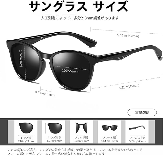 商品仕様: レンズ幅:53 mm(レンズの左端から右端までの幅は、フレームを含まないものとする ) レンズ高さ:45 mm(レンズの上端から下端までの高さは、フレームを含まないものとする) 全体のよこ幅:143mm(メガネ フレームの最も広い部分を左から右に测定します)ブリッジ幅:18mm;アームの長さ:145 mm;重量:約25g;ご注意:人工測定によって、多分2~3mm誤差があります