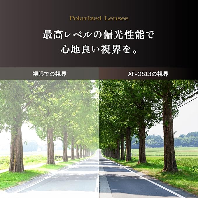 天候を選ばず偏光レンズのクリアな視界を:うすいカラーの偏光レンズは、晴天時だけでなく曇天、雨天時にも乱反射をカット。ドライブやアウトドアシーンで快適な視界を実現します。