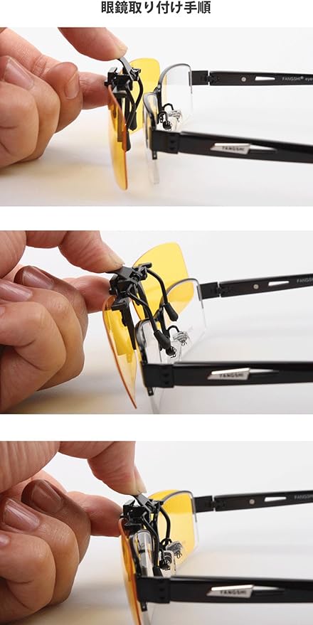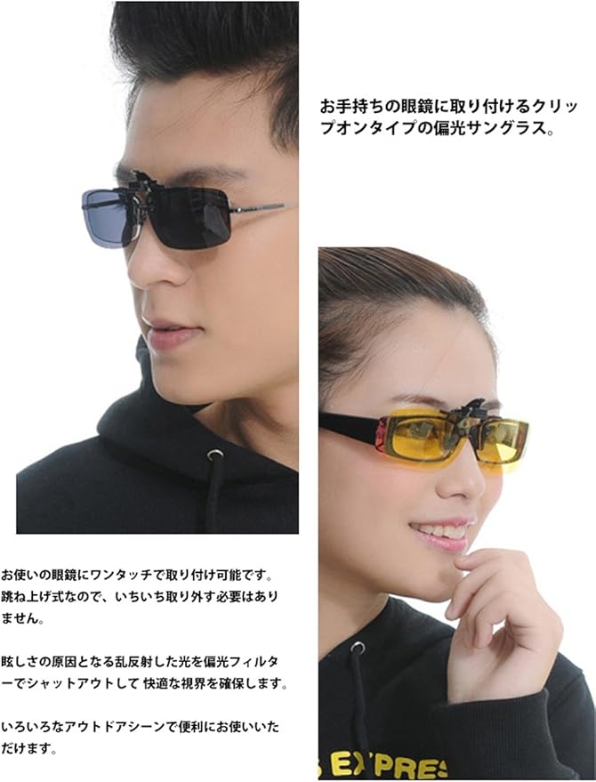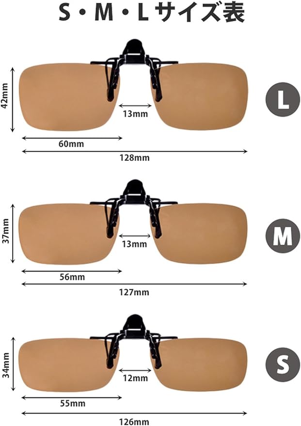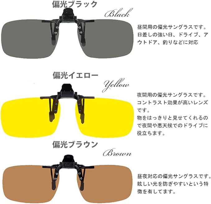 普段お使いの度付きメガネに挟むだけのクリップオン(跳ね上げ)タイプのサングラスです。メガネに合わせてS・M・Lの3サイズから選べます。カラーもブラック・ブラウン・イエローから2色お好きな組み合わせでご選択できます。