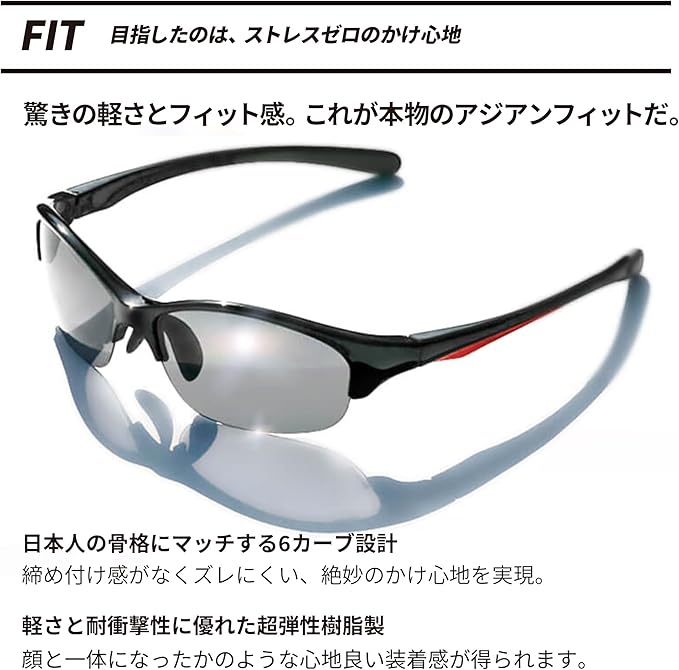 偏光サングラスにまぶしさ調光機能をプラスした偏光調光スポーツサングラス。「メガネの聖地」福井県の設計ノウハウを凝縮した超軽量アジアンフィット設計で、かけていることを忘れる程のフィット感。アクティブシーンを快適にお楽しみいただけます。