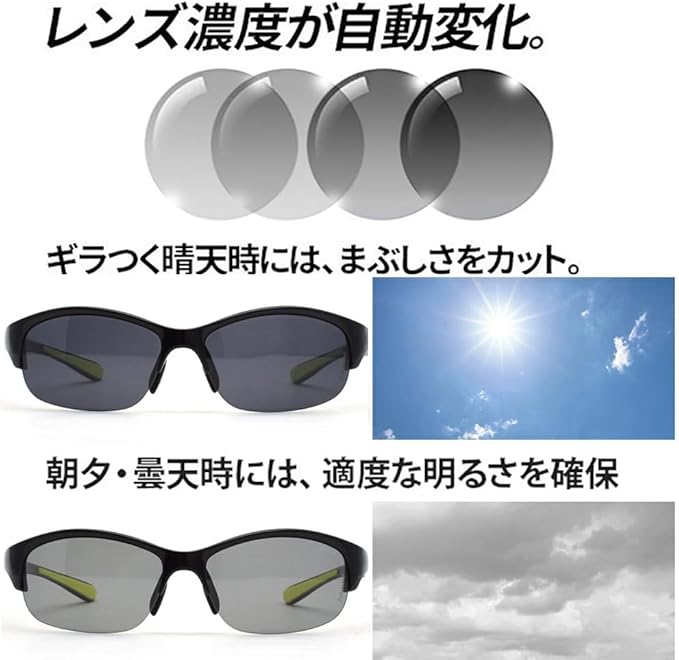 紫外線の量に応じてレンズ濃度を自動調節。晴天時はまぶしさを解消し、曇天時には必要なあかるさを確保。全天候でクリアな視界を確保できます。※当サングラスのレンズは紫外線の量で濃度変化するため、ドライブでご使用いただく場合はフロントガラスのUVカット機能でレンズ濃度の変化が小さくなります。お車の運転では視界がクリアな偏光サングラスとしてご活用ください。