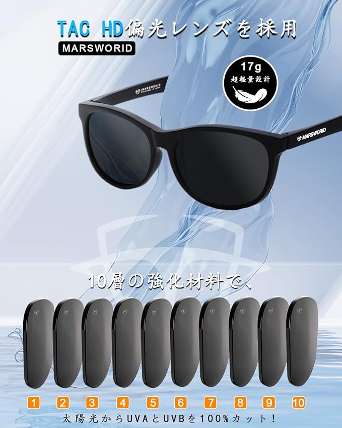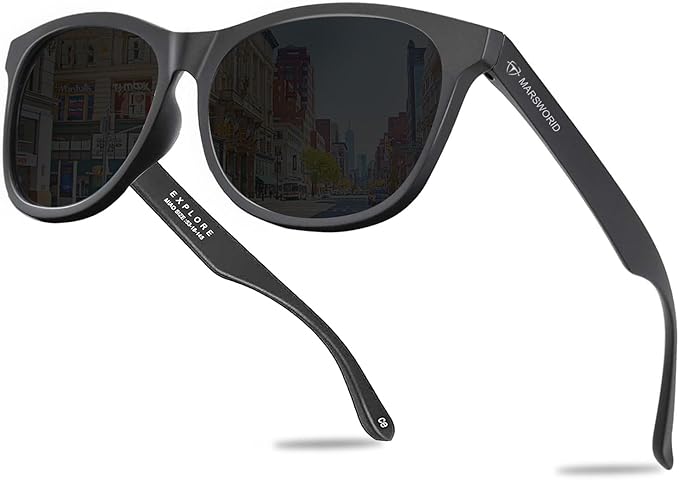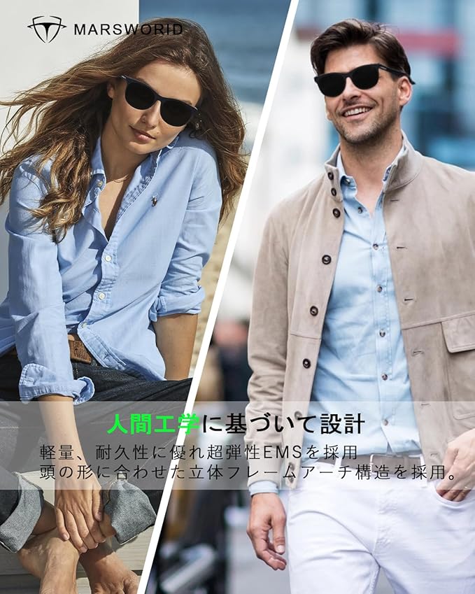 【高品質のTAC偏光レンズ】MARSWORIDサングラスはTAC偏光レンズを使用して、快適な視界を確保できます。芝生や水面の光の反射を防ぐ偏光サングラスでは、視界を妨げるまぶしい光をカットし、日光の眩しさを軽減し、目への負担を軽減することができます。紫外線を100%カットする偏光レンズで、外へ出かけたり運転をしたりと強い日差しを対応するサングラスです。