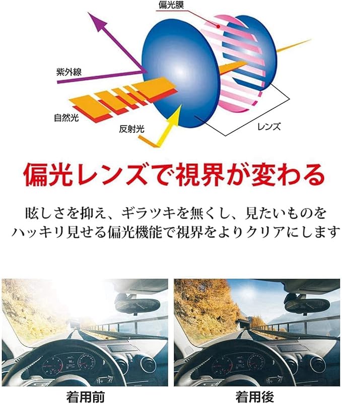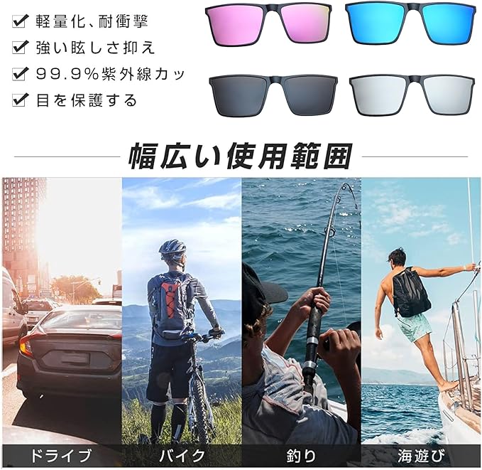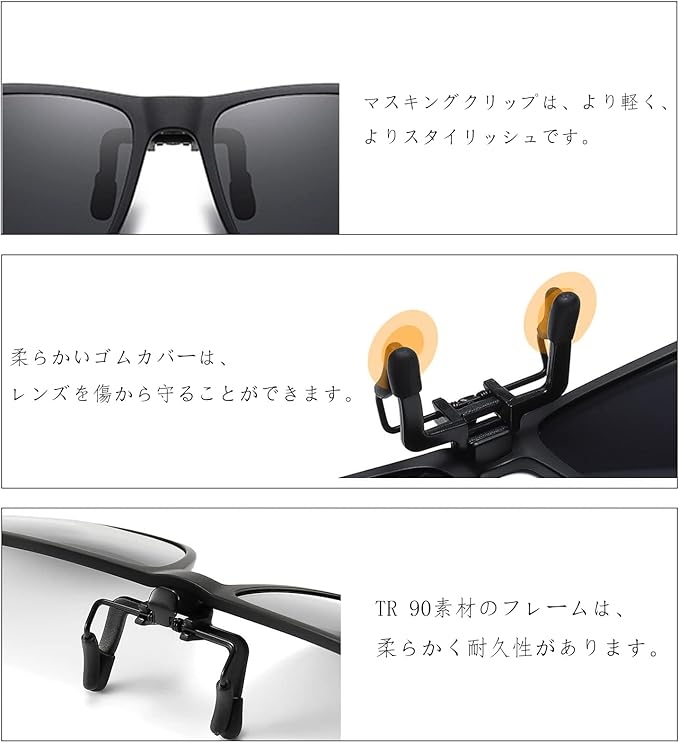 【装着快適】 お使いの眼鏡にワンタッチで取り付け可能、跳ね上げ式(クリップオン)なのでトンネルなど暗い所に入る時はい取り外す必要はございません。自転車、ドライブ、ラン ニング、釣り、レース、スキー、登山、トレッキング 屋外の活動に理想 的です。