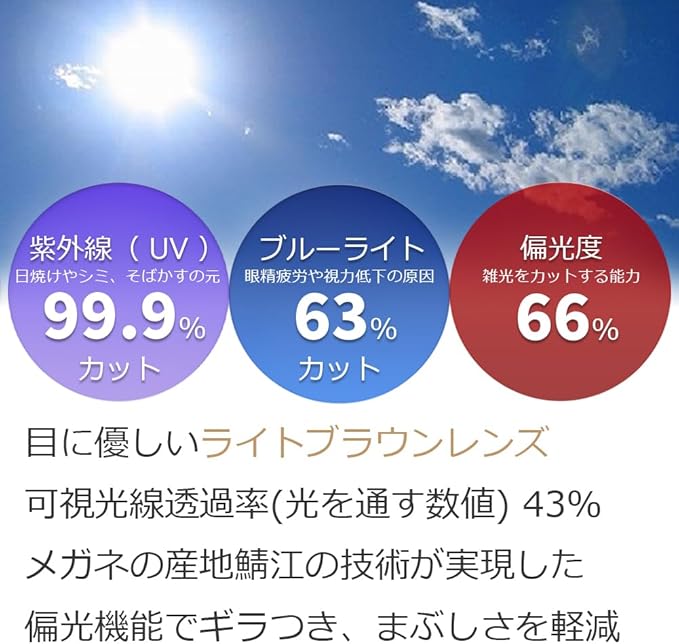 eight tokyoは株式会社エイトの商標登録アイウェアブランドです。日本製偏光機能レンズで有害な光線からしっかり目を守る。ドライブ サングラス。紫外線→ほぼ100%カット!可視光線透過率43%!偏光機能でギラつきカット!
