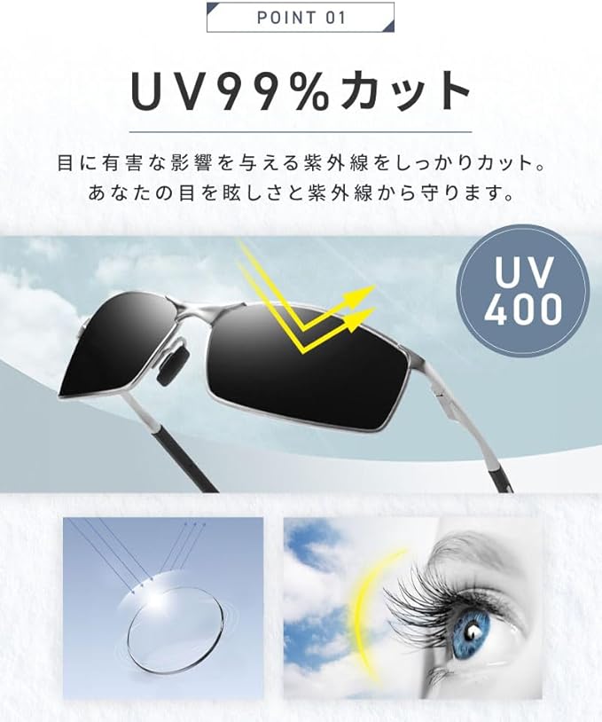 目に有害な影響を与える、紫外線をしっかりカット。UV99%カットで、あなたの目を眩しさと紫外線から守ります。