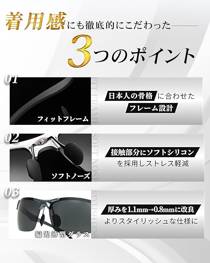 【ジャストフィット設計 超軽量25g ソフトノーズ】ビジュアル・機能性だけでなく①日本人の骨格に合わせたフレーム設計 ②鼻の接触部分にソフトシリコンを採用 ③25gへの軽量化 など、ストレスフリーな着用感にも拘りを持たせました。