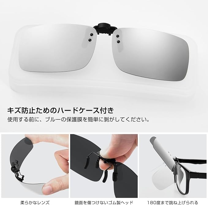 近視メガネの上に直接かけるタイプのサングラスで、クリップオン方式なので取り付けが簡単で応用力が強いです。 偏光機能とUV400機能を備えているので、日差しの強いアウトドアシーンにも最適です。