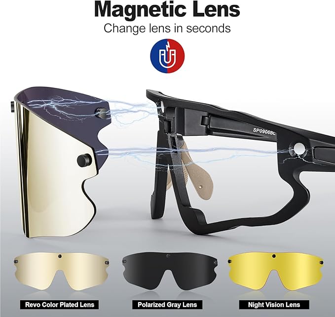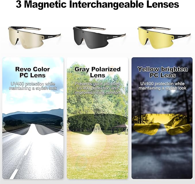 【3つの磁気交換レンズ】カラーPCレンズ、グレー偏光レンズ、ナイトビジョンPCレンズ、磁気レンズ交換機能により、最も密着した吸着効果が得られ、鏡面に触れることなく、異なるカラーレンズを素早く交換できます。【グレーレンズのみが偏光です】