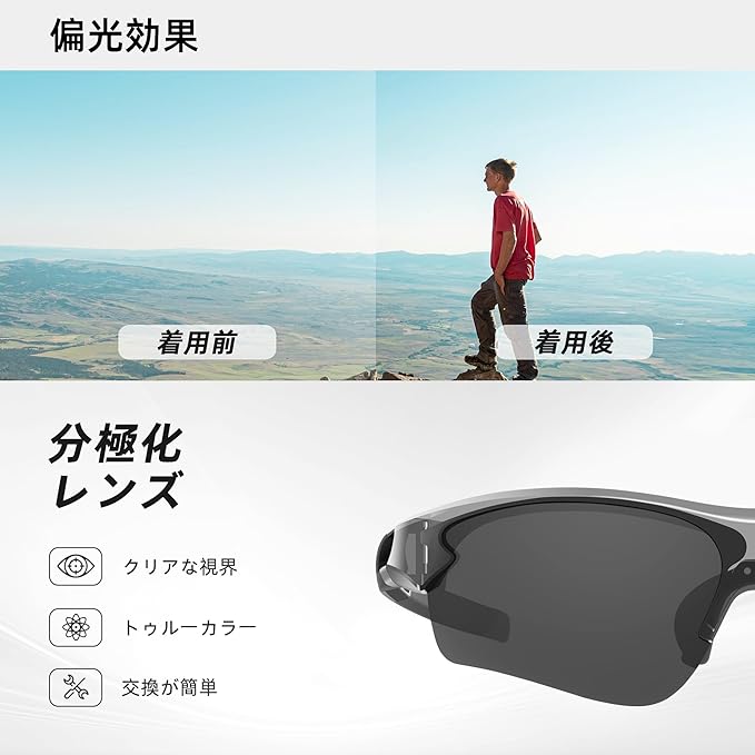 優れたUV保護:当社の偏光スポーツサングラスはTAC素材でできており、UV400レンズは100%有害なUVAおよびUVB光線をブロックし、サイクリング、旅行、釣り、野球、ゴルフ、ランニング、登山、運転、テニス、スキーなどの野外活動中に目を最大限に保護します。
