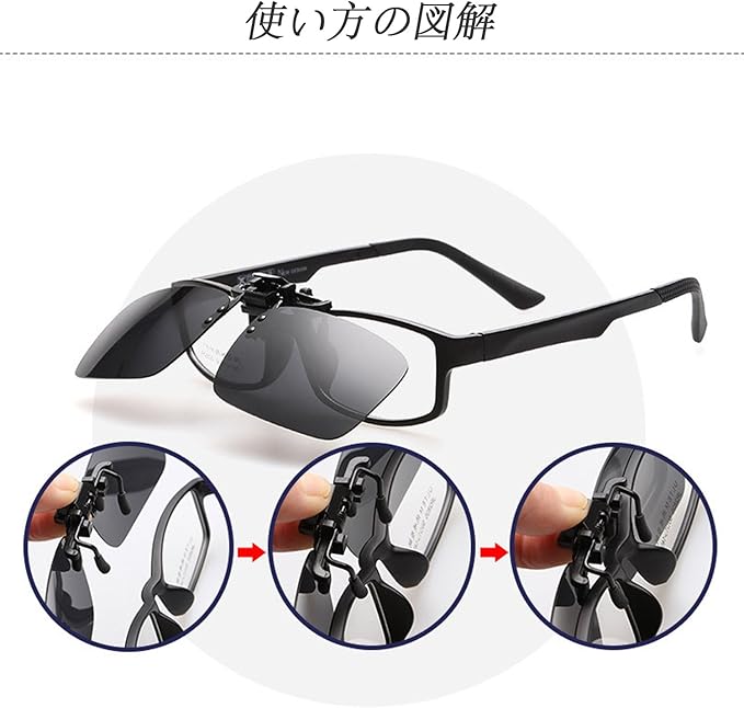 クリップをメガネに挟んで使用します。レンズを下ろすだけで普通のメガネからサングラスに変えることができます。素早く取り付けられ、簡単に使用します。