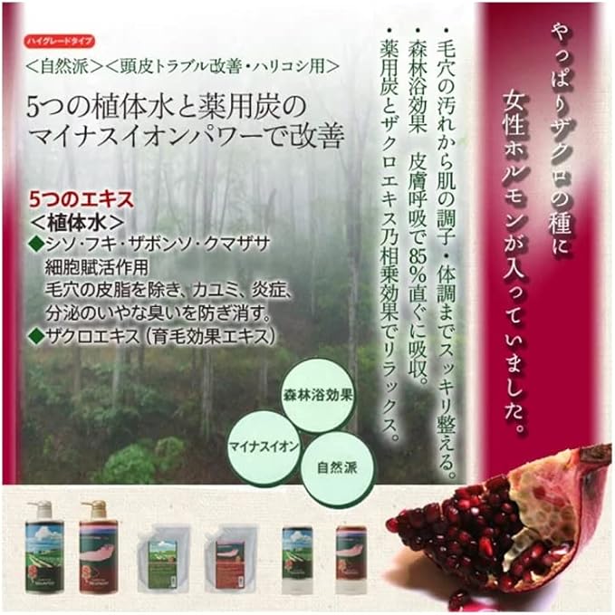 炭と5つの植体水エキス(植物から抽出したエキス)のパワーで、髪と地肌に輝きとうるおいを。自然派志向のシャンプー。頭皮の乾燥と荒れを防ぎ、毛穴の皮脂を除き、分泌の嫌な頭の臭いを防ぎます。育毛環境を整え、ハリのある健髪へ導きます。※植体水エキス→保湿剤:ザクロ種子・シソ葉・フキ葉/茎・サボンソウ葉エキス・クマザサ葉エキス配合 ▼このような方にオススメ ・頭皮が脂っぽい方に・フケ・カユミが気になる方に・やせ毛・抜け毛が気になる方に・頭皮の荒れ、赤っぽい地肌が気になる方に