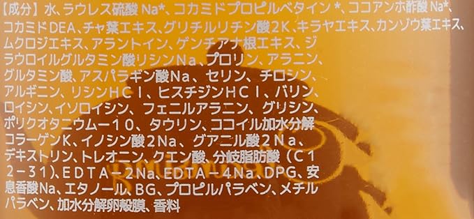 水、ラウレス硫酸Na、コカミドプロピルベタイン、ココアンホ酢酸Na、コカミドDEA、チャ葉エキス、グリチルリチン酸2K、キラヤエキス、カンゾウ葉エキス、ムクロジエキス、アラントイン、ゲンチアナ根エキス、ジラウロイルグルタミン酸リシンNa、プロリン、アラニン、グルタミン酸、アスパラギン酸Na、セリン、チロシン、アルギニン、リシンHCI、ヒスチジンHCI、バリン、ロイシン、イソロイシン、フェニルアラニン、グリシン、ポリクオタニウム-10、タウリン、ココイル加水分解コラーゲンK、イノシン酸2Na、グアニル酸2Na、デキストリン、トレオニン、クエン酸、分岐脂肪酸C12-31)、EDTA-2Na、EDTA-4Na、DPG、安息香酸Na、エタノール、BG、プロピルパラベン、メチルパラベン、香料