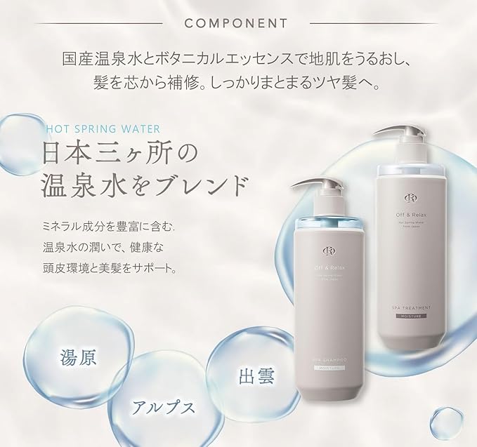 シャンプー:水、ココイルメチルタウリンNa、ラウリルヒドロキシスルタイン、コカミドメチルMEA、ココイルアラニンNa、温泉水、サッカロミセス/コメ発酵液、酒粕エキス、チャ葉エキス、センブリエキス、マグワ根皮エキス、カミツレ花エキス、加水分解コーンスターチ、ジラウロイルグルタミン酸リシンNa、グリチルリチン酸2K、トウミツ、ヤシ脂肪酸Na、ヤシ脂肪酸、プロパンジオール、ポリクオタニウム-10、PPG-3カプリリルエーテル、塩化Na、BG、香料、クエン酸、EDTA-2Na、安息香酸Na、フェノキシエタノール トリートメント:水、ステアリルアルコール、アモジメチコン、ステアロキシプロピルトリモニウムクロリド、セタノール、温泉水、サッカロミセス/コメ発酵液、酒粕エキス、チャ葉エキス、センブリエキス、マグワ根皮エキス、カミツレ花エキス、加水分解コーンスターチ、ジラウロイルグルタミン酸リシンNa、グリチルリチン酸2K、トウミツ、プロパンジオール、PPG-34、BG、ベヘナミドプロピルジメチルアミン、ヒドロキシエチルセルロース、香料、乳酸、EDTA-2Na、ベンジルアルコール、フェノキシエタノール