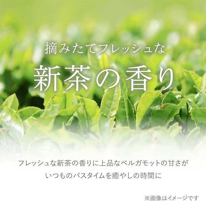 【心が落ち着く新茶の香り】ほんのり甘くて瑞々しい新茶の若葉の香りにベルガモットなどの爽やかで弾けるような香り。春の生き生きとした明るい緑の新茶を思わせ、ポジティブな気分にさせてくれます。