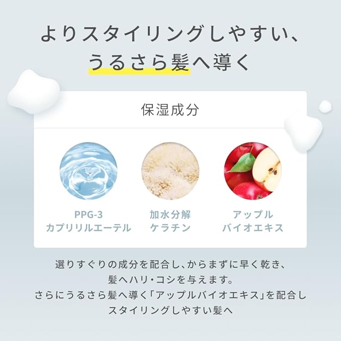 【「仕上がり」の気持ち良さ】洗い上がりの仕上がりにもポイントが。重さで“しっとりまとまる”のではなく、軽さもありながら“さらっと軽やかにまとまる”ことで、サロンで実感するような仕上がりに。