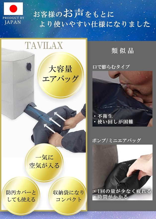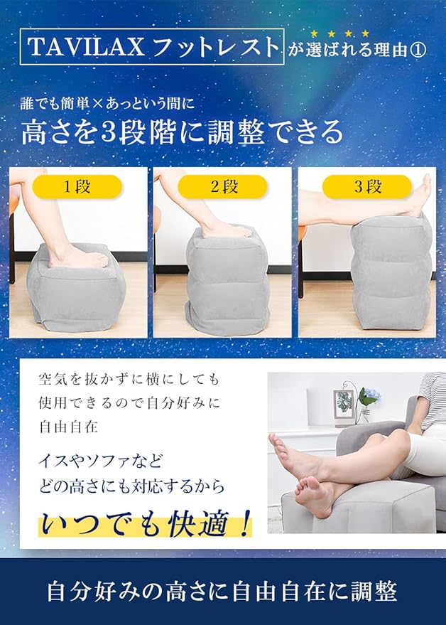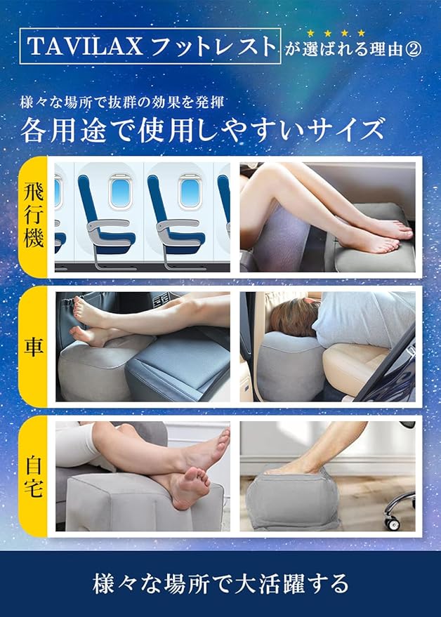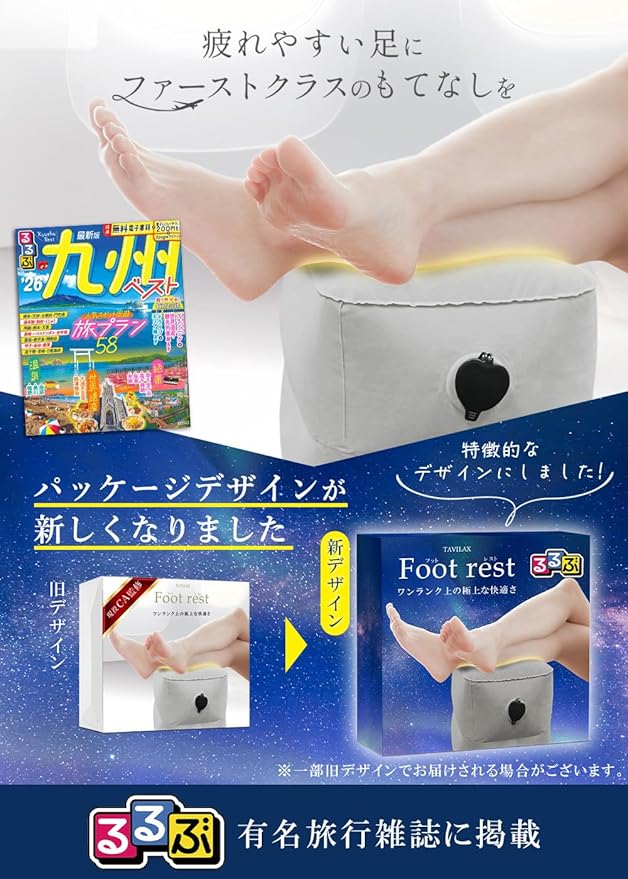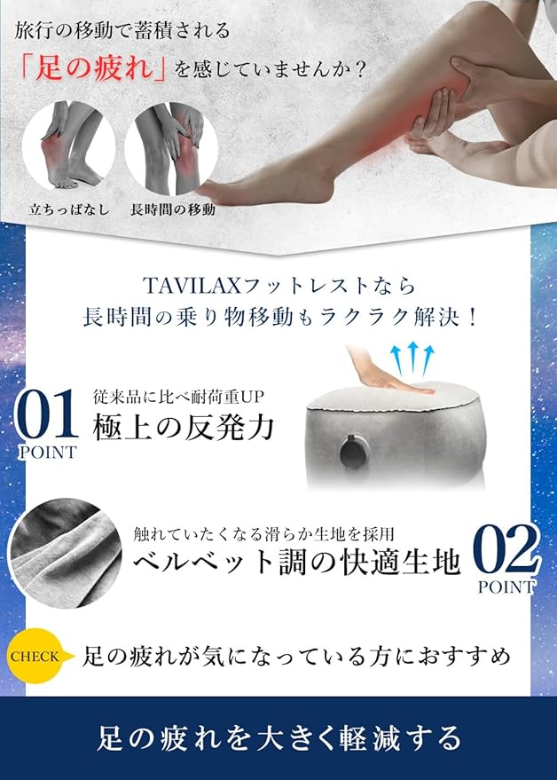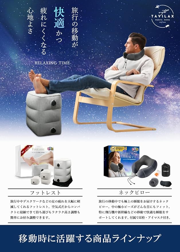 【ちょっと贅沢な移動時間】旅行や外出の移動を快適に過ごせるだけでなく、ゆとりのある姿勢を保てることで、心までリラックスし贅沢な移動時間を過ごせる足枕。TAVILAXが満を持してご提供する旅行便利グッズ。