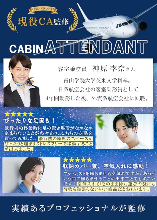 【現役CA監修のフットレスト】 機内の過ごし方のプロとも言えるCAが監修するフットレストだからこそ、ベストなエアークッションに仕上がりました。飛行機内での空間がより一層に楽しい思い出となるよう座席で心地よく過ごせる設計にこだわりました。エコノミー症候群 予防グッズとしてもご好評をいただいております。国内旅行 海外旅行問わずご使用可能です。