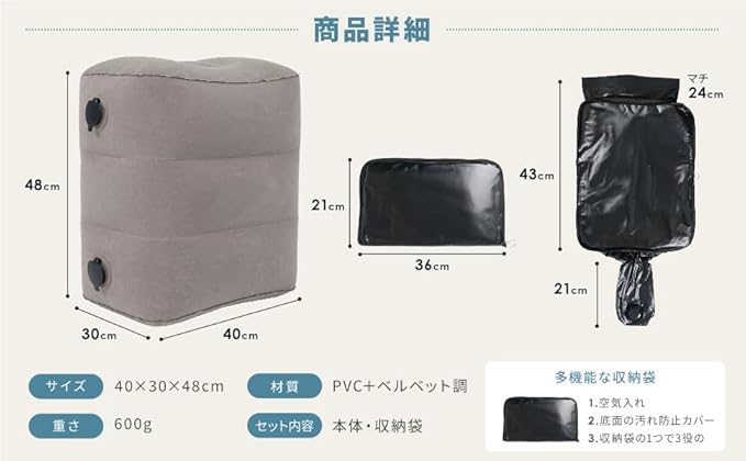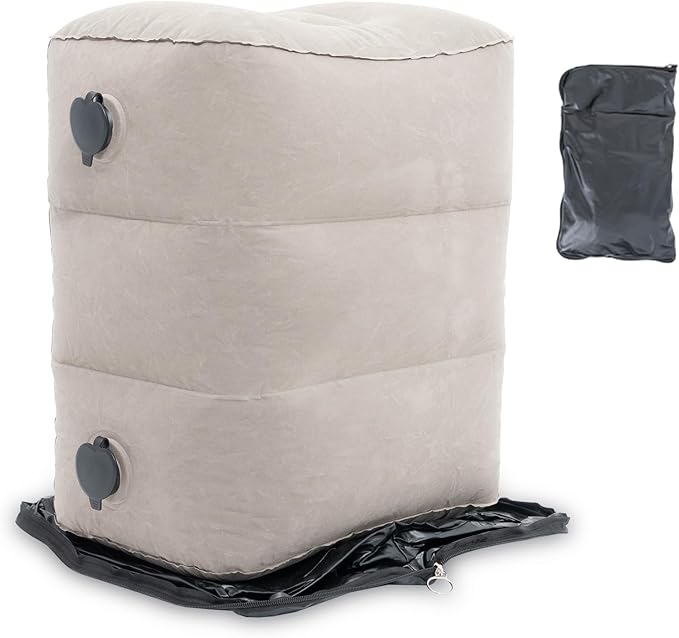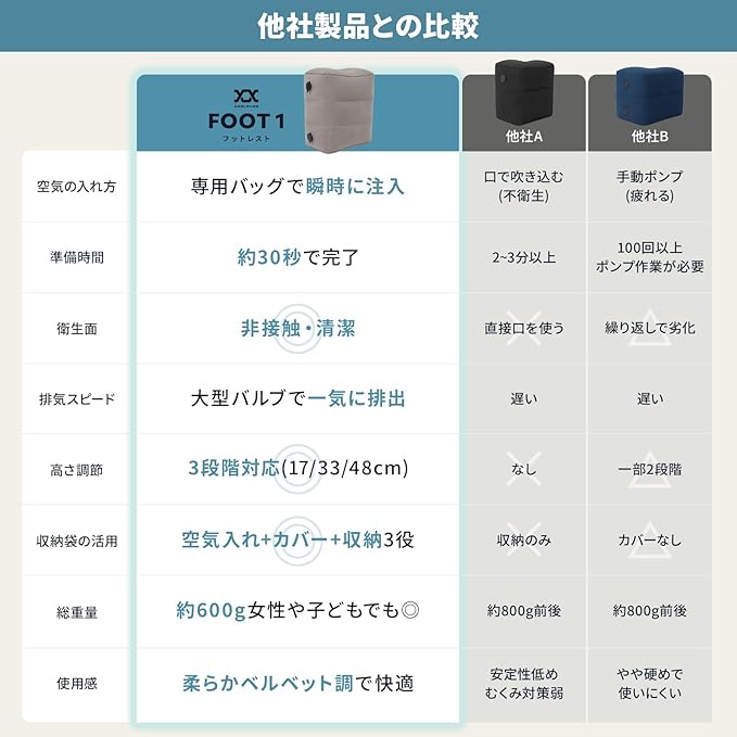 adelphos フットレスト 飛行機 車 夜行バス デスク下 エアー ポンプ不要 急速充填&排気 3段階高さ調節 折りたたみ 軽量 コンパクト 空気逆流防止弁 大容量空気入れ FOOT1 (1個)