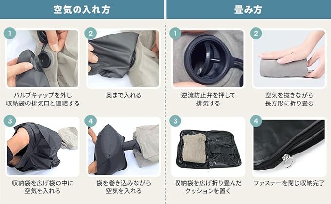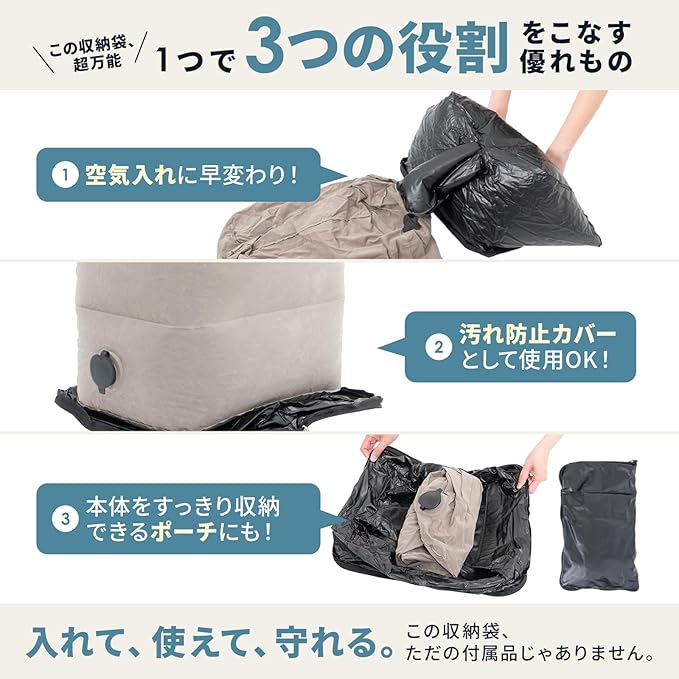 ①空気入れ②汚れ防止カバー③収納ポーチ1つで3役をこなす超万能な収納袋。