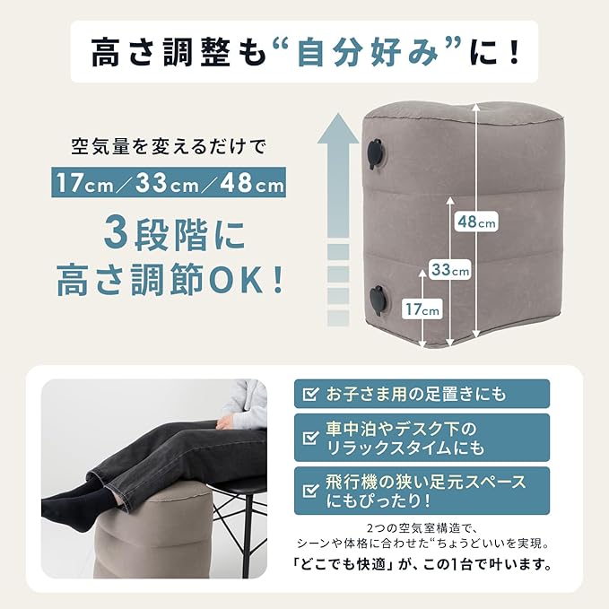 17cm/33cm/48cmの3段階に高さ調節ができ、2つの空気室構造でシーンや体格に合わせたちょうどいいを実現。