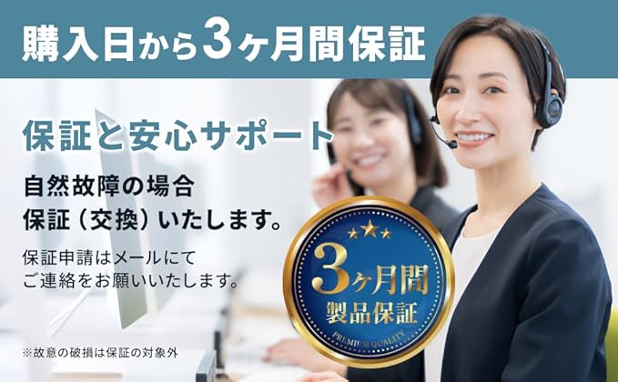 【製品保証3ヶ月】購入日から3ヶ月間保証。自然故障の場合保証(交換)いたします。(故意の破損は保証の対象外)**保証申請はメールにてご連絡をお願いいたします。