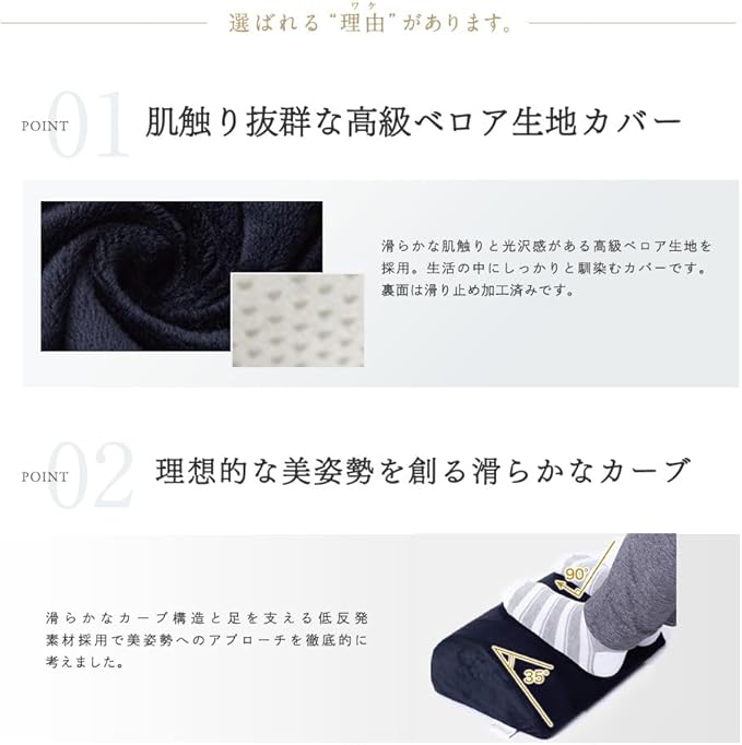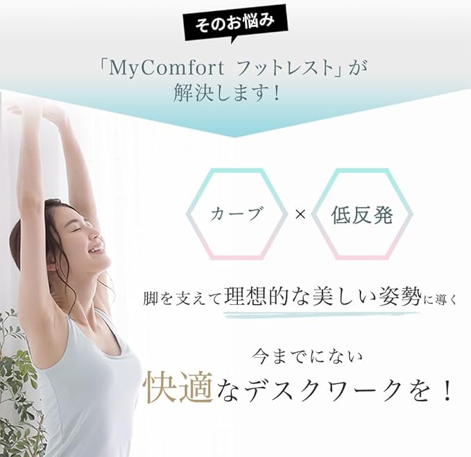 【足元から創り上げる理想的な美姿勢】累計販売個数100万個MyComfortシリーズからワンランク上のプレミアム フットレスト が登場。肌触り抜群の高級ベロア生地と滑らかなカーブ構造を採用し、足元から美姿勢へアプローチ。数年にも及ぶ試行錯誤の末、開発チームと日本人に最適な フットレスト のカーブ角度(35度)を考案し、ようやく製品化にたどり着くことに成功。更に足をしっかり支える低反発素材を採用することで、今までにない極上感と美姿勢へのWアプローチを実現。今すぐ快適な デスクワーク を実感してください。