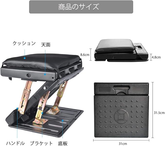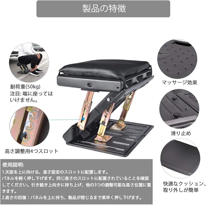 上に座っても良い:足置きだけではなく、簡易的なイスとしても使用できます。このフットレストの高度は最大32 ㎝の高さを調節できます。高度の段階だけ調節して、上に座って休んでもいいです