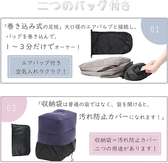 BubuBubu 足置き 足枕 クッション エアーフットレスト エアーオットマン 携帯便利 ポンプ不要 足元クッション 空気入れ簡単 空気抜き簡単 3段階高さ 収納袋付き 旅行便利グッズ オフィス デスク下 オットマン 足置き台 飛行機 車用 車中泊 就寝用 足のむくみ エコノミー症候群対策 (グレー)