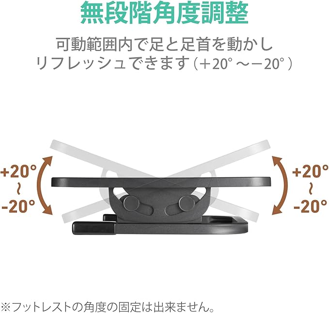 座り方やイスの高さに合わせて前後-20 ~20 の角度に無段階調整可能です。※フットレストの角度の固定はできません。