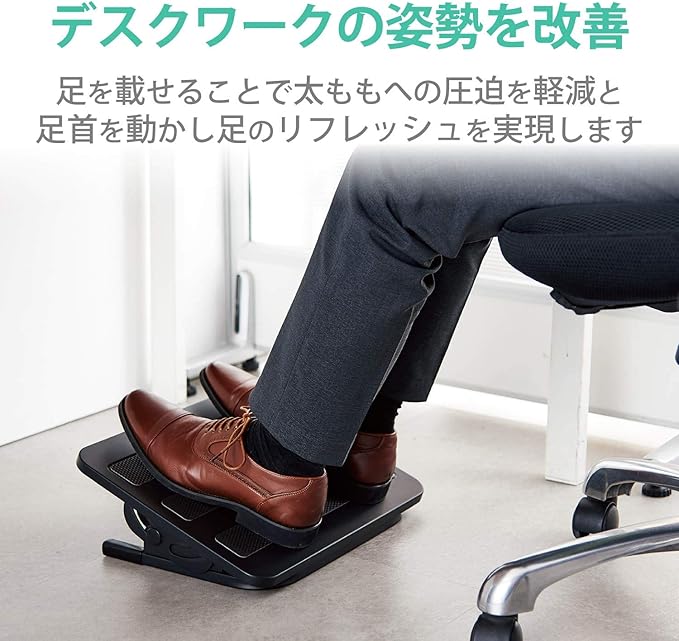 足を乗せることでデスクワーク時の姿勢改善、足への負担を軽減できるフットレストです。