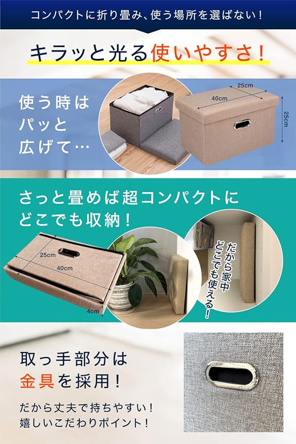 ✅【コンパクトで組み立て簡単】収納スツールは説明書いらずで、安心簡単組立て。セットアップにかかる時間はわずか数秒で、急な来客時でもサっと出せて椅子にもなります。ストレージチェアを使わない時は折りたたみできるのがポイントです。コンパクトに収納できます。他のオットマンに比べ、取っ手付き付きなので丈夫で持ち運びに便利。収納スツールは収納力抜群。玩具、本や雑誌、リモコン、雑貨、毛布など収納可能。ごちゃごちゃした物を収納スペースにお片付け。多用途な収納ボックスで足置き、おもちゃ箱、雑貨収納ボックスとして活躍。玄関のちょっとしたイスにもなります。