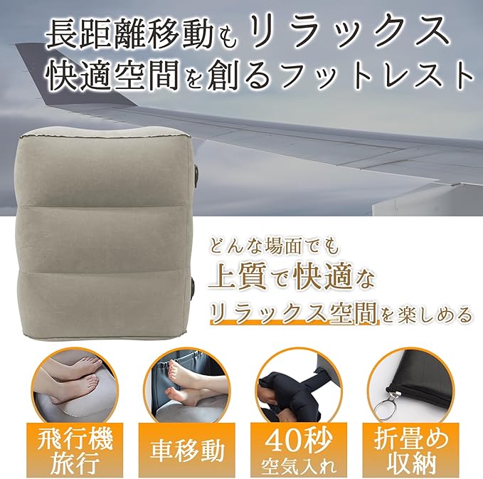 【足元を快適に!エアーフットレスト!】フットレストは椅子に座っているときの姿勢を整えられ、リラックスした姿勢を自然にサポート!高反発クッションが膝から下を投げ出すことで足全体が支えられ、長時間の移動やデスクワークに最適です。大人から子供まで使える旅行用エアーフットレストです。