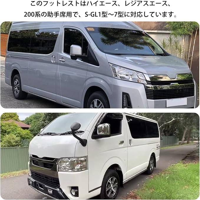 [適応車両] このフットレストはハイエース、レジアスエース、200系の助手席用で、S-GL1型~7型に対応しています。DX車には装着できませんが、DXの運転席・助手席2人乗りシート仕様には取り付け可能です。