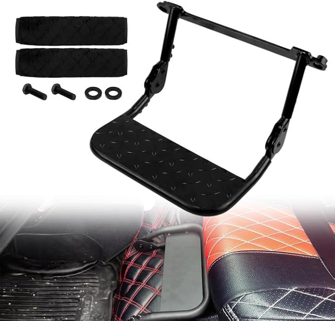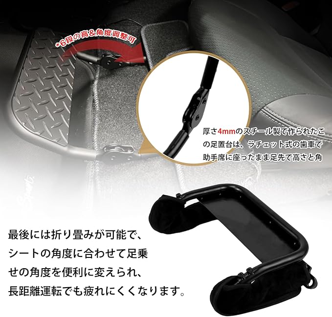 [便利な調整機能] 厚さ4mmのスチール製で作られたこの足置台は、ラチェット式の歯車で助手席に座ったまま足先で高さと角度を6段階に調整できます。最後には折り畳みが可能で、シートの角度に合わせて足乗せの角度を便利に変えられ、長距離運転でも疲れにくくなります。