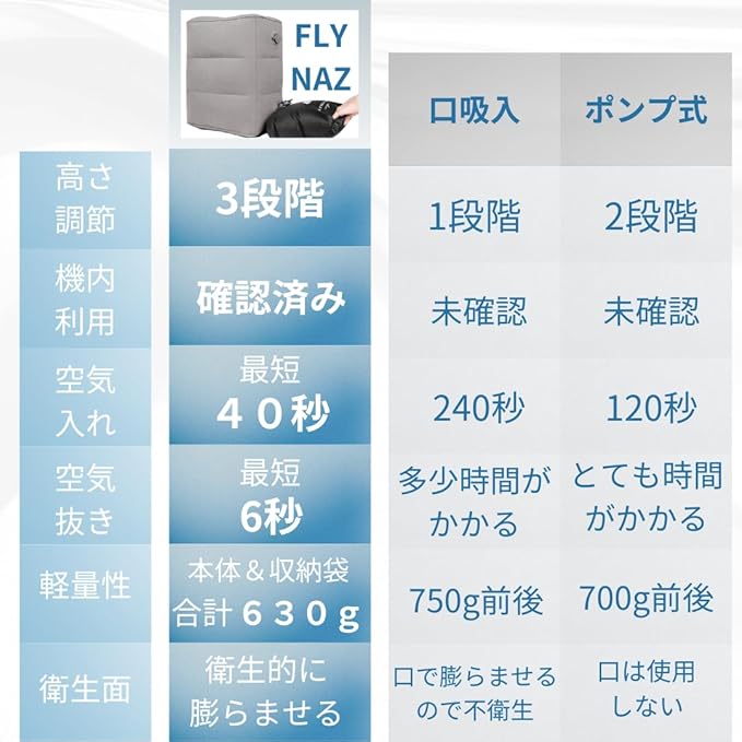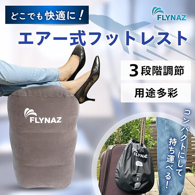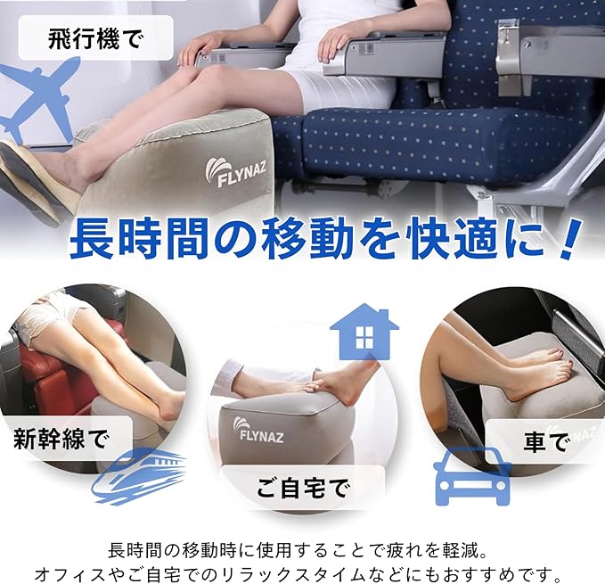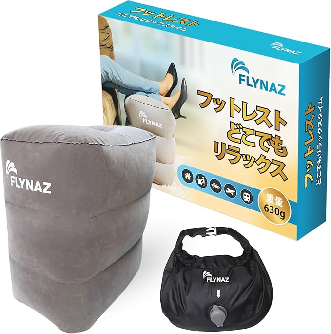 FLYNAZ,フットレスト 飛行機 エアー足枕 足置き 【空気入れ40秒で完了】三段 階高さ調整 折りたたみ式 コンパクト設計 ポンプ不要 足置き クッション 飛行 機・車・新幹線・旅行用 快適グッFLYNAZ