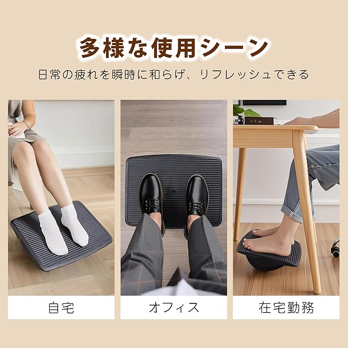 【多様な使用シーン】自宅でのリラックスタイムはもちろん、在宅勤務中や通勤の合間でも使用できるこのアイテムは、副運転席に置いても便利。日常の疲れを瞬時に和らげ、リフレッシュでき、様々なシーンでの使用が可能。脚を自然な位置に保ち、血行を促進することで、長時間座っていても快適さを保ちます。