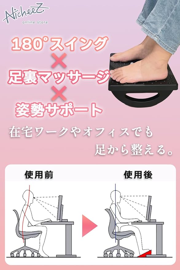 【自由なスウィング&マッサージローラー】最大180 の可動域で足を心地よく揺らせ、足裏をやさしく刺激するローラーで血行を促進します。リラックスしながら姿勢が整い、むくみや疲労を軽減しながら作業効率がアップします。座ったままでもスッキリ軽やかな足をキープでき、仕事終わりに足がだるくならず毎日がもっと快適になります。