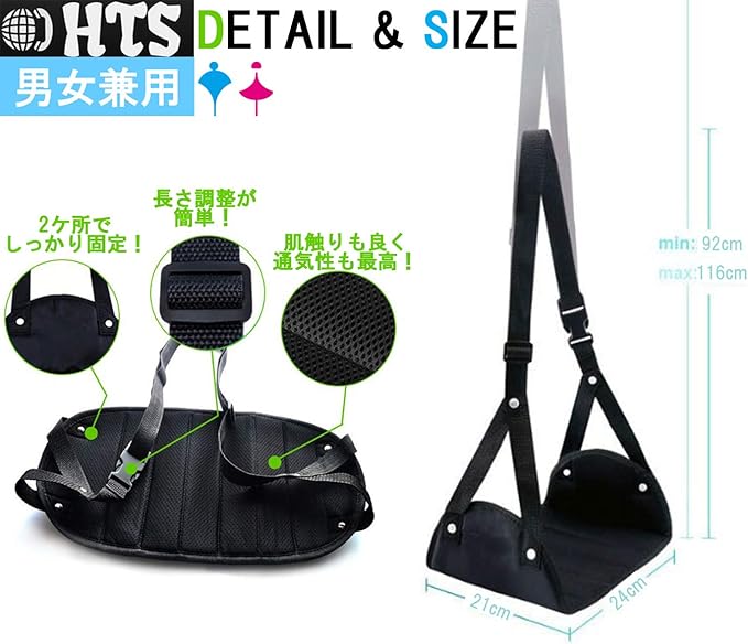 【使い方は非常に簡単】前方の座席に引っ掛けるだけで簡単に取付けることができます。お好みの高さに調整し良い姿勢を保ちます。ベルトは調節できます、調節可能な長さは92-116cmです。
