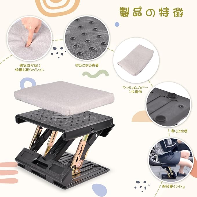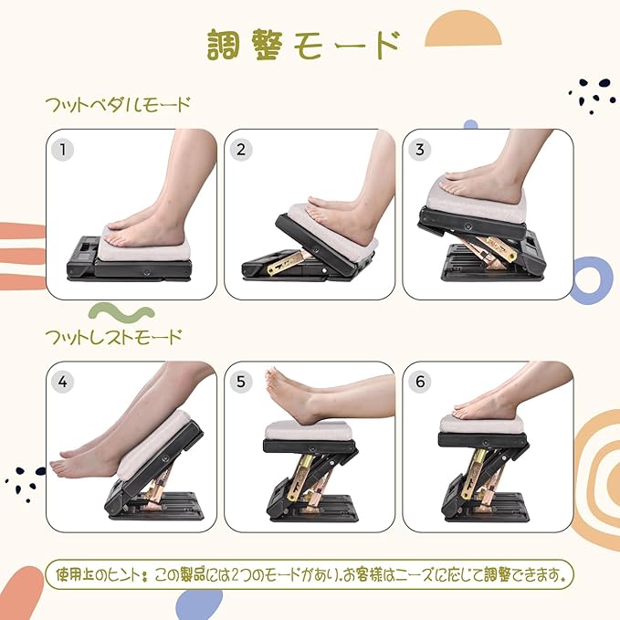 多機能:4つの角度モード、4つの位置調整可能、高さに従って異なる使用モードを選択して、自宅、地下鉄、飛行機、オフィスの机の下、ソファの横などに使います。多様な足のトラブルを緩和する